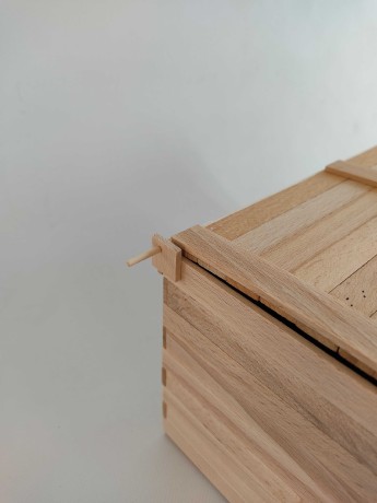 Vrtákem pr. 4mm navrtáme v rozích dvou lišt č.1 otvory. Potřeme lepidlem a nasuneme na trny přiklopeného zarovnaného víka s přední hranou truhličky a přilepíme. Víko leží volně. Necháme přischnout. Otvory budou bez lepidla!