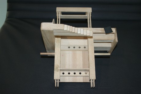 Ochranné vodící lišty pro japonskou pilku, vedenou uvnitř přípravku. Hotové umělecké dílo. Jirka - Robotárna, SVČ Helceletka